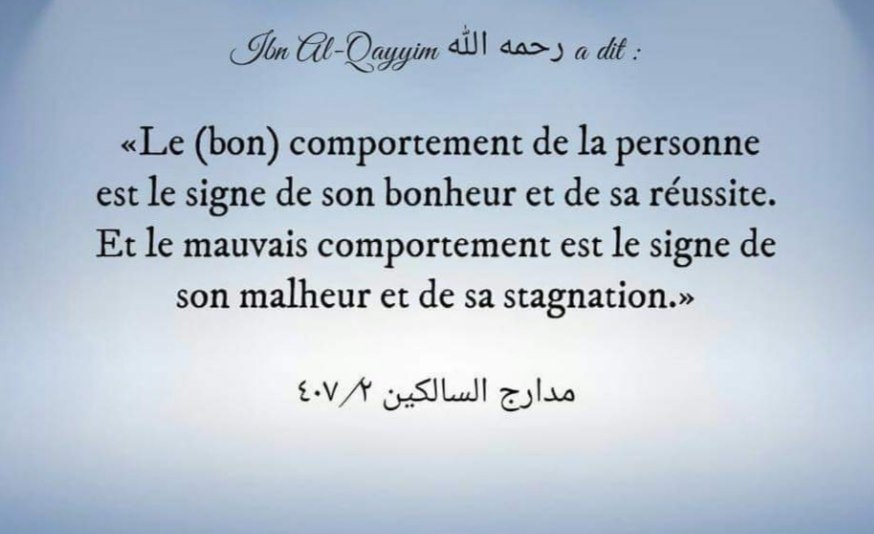 Ibn Al Qayyim – Le bon comportement Le bon comportement et le civisme sont vos meilleurs atouts. Partager : Cliquer pour partager sur X(ouvre dans une nouvelle fenêtre) X Cliquez pour partager sur Facebook(ouvre dans une nouvelle fenêtre) Facebook J’aime chargement… Articles similaires Laisser un commentaire Annuler la réponse. Δ